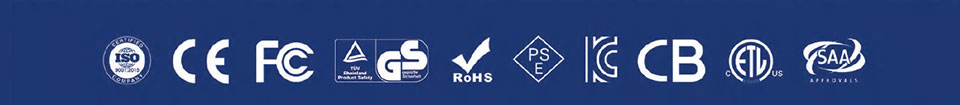 每年通过ISO 9001和BSCI认证。拥有产品认证G.S, CE, UL, ETL, FCC, KC, PSE, SAA等。